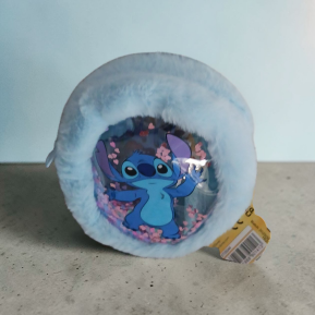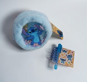 Das kuschelige Stitch - Schreib - Set besteht aus einer flausichgen Mini - Tasche und einem klienen Spiral - Notizblock mit einem Stift.