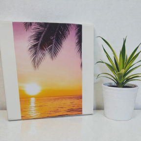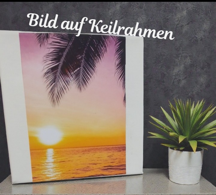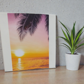 Stimmungsvolles Bild auf Keilrahmen. die warmen Gelb -, Organge - und Rosatöne des Himmels trffen auf das ruhige Meer, während filligrane Palmenblätter dem Motiv eine entspante Urlaubsatmosphäre verleihen. Der hochwertige Leinwanddruck ist auf einen stabilen Keilrahmen befestigt und überzeugt durch brillante Farben sowie eine elegante Optik.